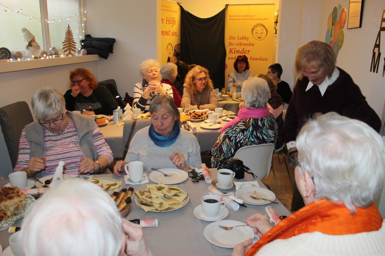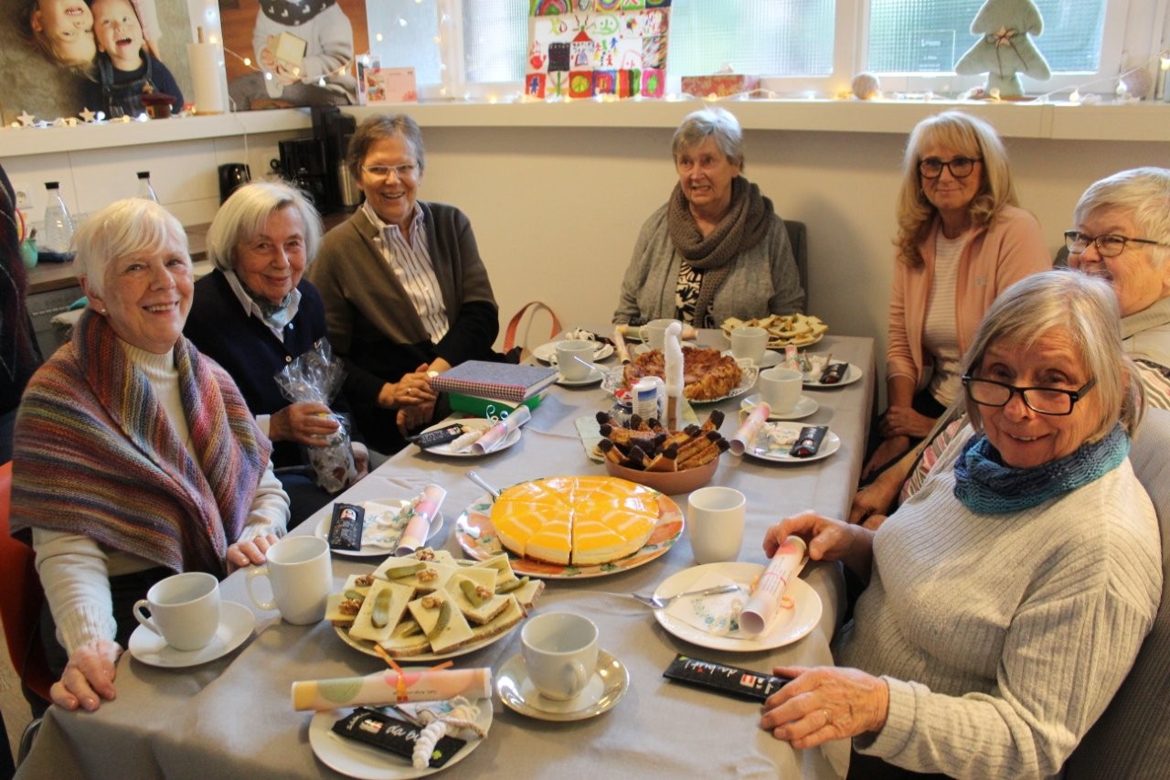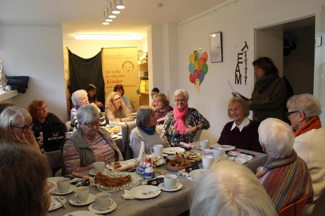 Traditionell laden wir unsere Flinken Nadeln um die Weihnachtszeit zu einem gemütlichen Kaffeetrinken in unsere Gruppenräume ein. Die Bunte Kreis Mitarbeiterinnen hatten sich mit liebevoller Dekoration, feinen Bäckereien, aber auch herzhaften Schnittchen mächtig ins Zeug gelegt, um diejenigen rundum zu verwöhnen, die das ganze Jahr über fleißig für den Bunten Kreis handarbeiten, organisieren und ihre einmaligen Produkte gegen Spenden anbieten. Die Damen fühlen sich sichtlich wohl. Besonders wurden sie mit selbstgedichteten Reimen geehrt.